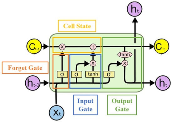 To better capture the trend, dynamic changes, and complex nonlinear relationships of battery performance degradation, we used the output of the transformer module as the input of the LSTM module, aiming to process battery degradation sequence data and effectively capture long-term dependencies. The LSTM model consists of a cell state, forget gate, input gate, and output gate, as shown in Figure 9. During the training process, the cell state is used as long-term memory to save the key information in the input sequence; the forget gate determines which data should be deleted from the cell state to prevent information overload; the input gate controls which new information needs to be added to the cell state and updates the memory content; the output gate determines which data to output to the next time step based on the current cell state and input information. Through this mechanism, LSTM optimizes the weights of each gate via backpropagation during training, thereby improving model’s prediction accuracy.