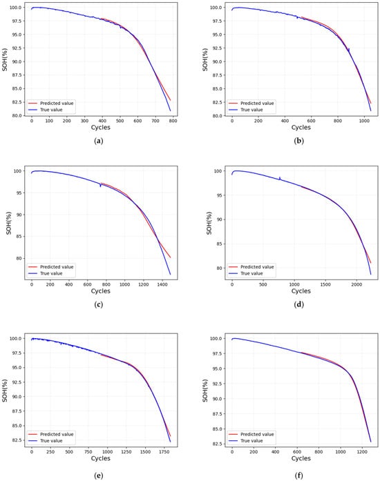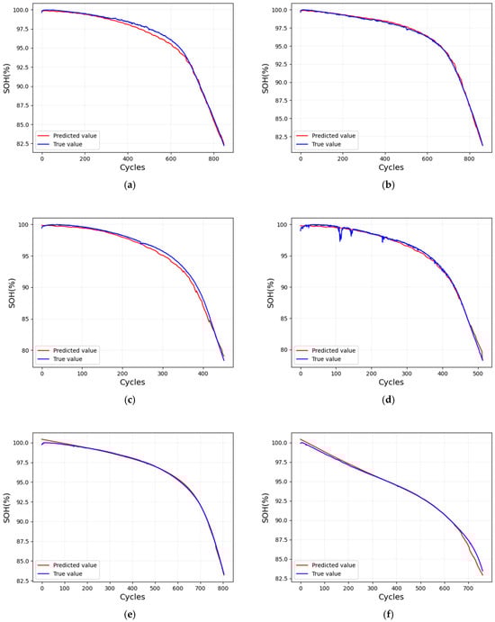 The SOH prediction results for different batteries are shown in Figure 11. Although the cycles of different batteries vary from 463 to 874, their SOH change trends show similar decay patterns. Even so, the model demonstrates excellent predictive performance on the test set. The predicted value (red curve) is highly consistent with the true value (blue curve), especially in the critical stage of battery decay, and the prediction model can accurately capture the change in SOH. In particular, for the battery with channel number 36 in the batch “2017-05-12” and the battery with channel number 20 in the batch “2018-04-12”, the predicted RMSE and MAE values are both less than 0.002, as shown in Table 2, showing extremely low prediction errors and the high-precision prediction ability of the model on these batteries. For the battery with channel number 17 in the batch “2017-06-30”, the figure shows that the SOH is interfered with by noise, but the model can still accurately reflect the overall decay trend of the battery. As for the battery with channel number 30 in the batch of “2018-04-12”, unlike other batteries, its SOH maintained a similar downward trend throughout the cycle. Although there was a certain deviation between the predicted value and the true value at the beginning and end of the data, the overall performance remained consistent. These results show that the model performs stably on different batteries and can effectively handle the complexity and differences in battery SOH prediction.