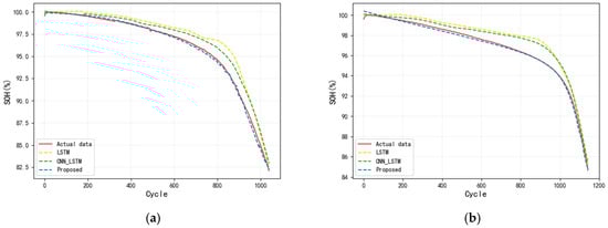 where is the number of samples, is the actual SOH, and is the predicted SOH. Generally speaking, the smaller the values of RMSE and MAE, the higher the model’s prediction accuracy, indicating that the model’s performance is better.