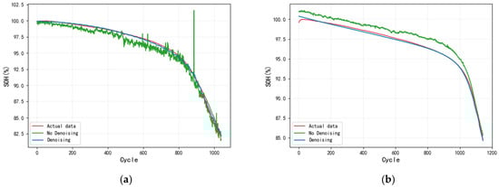 We thoroughly investigated the noise level within the dataset and its effects on the prediction accuracy and model robustness of SOH. As illustrated in Figure 4, there are some outliers in the dataset that are obviously deviant, and some of them are far from the overall data curve. If the curve containing these outliers is directly normalized and correlated, these features are obviously unable to effectively characterize SOH. Through experiments, it was found that there were notable differences between the features after noise removal and the features selected for the non-denoised data. Although the features selected for the non-denoised data retained some capacity to characterize SOH, their prediction performance was considerably inferior, as depicted in Figure 13. Compared with the prediction results after denoising, the prediction error of the non-denoised model is larger, the prediction curve appears to be more unsmooth, and abnormal prediction values appear. These findings underscore the substantial negative impact of noise on prediction performance, highlighting that denoising significantly enhances the model’s prediction accuracy.