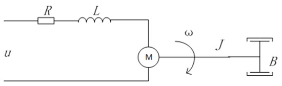 Let denote the voltage, the back electromotive force, the inductance, the resistance, the moment of inertia of the mechanical rotating part of the motor (1), the viscous friction coefficient of the rotating part of the motor (1), the torque constant, and the back electromotive force constant. The current , the rotational speed , and the rotation angle of the motor (1) are selected as state variables: