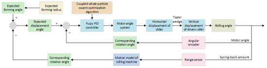 To address the issue that the springback of the sheet during the circular rolling process affects the final forming accuracy, an improved fuzzy PID controller based on the springback compensation strategy is designed. This controller modifies the springback of the sheet by adjusting the rolling angle in real time. A block diagram of its control algorithm is shown in Figure 5.