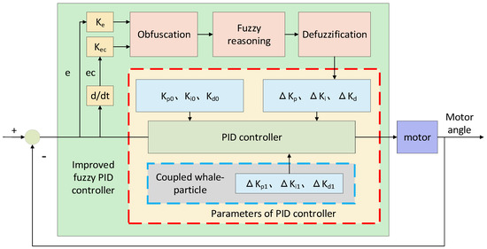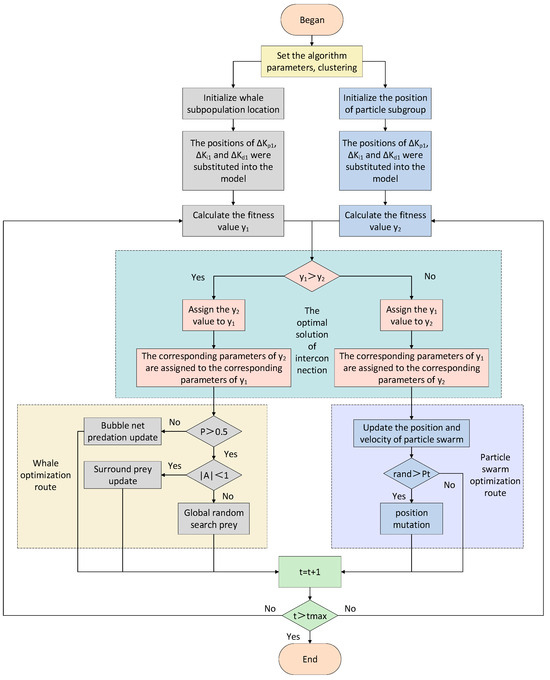 The coupled whale particle (CWP) algorithm integrates the rapid convergence property of the whale optimization algorithm (WOA) and the global search characteristic of the particle swarm optimization (PSO). It is designed to identify the optimal solution in a more expeditious and precise manner, thereby reducing the search space and curbing the consumption of computational resources. By minimizing the convergence deviation, it enhances the overall accuracy of the algorithm. Moreover, this algorithm can be applied to a diverse range of scenarios, circumventing the ineffectiveness of a single algorithm in certain specific situations. In the CWP algorithm, particles are partitioned into two independent search groups. The random parameters of these two groups are initialized, and their corresponding fitness values are computed. Subsequently, the smaller (i.e., superior) fitness value is extracted, which serves as the optimal solution for the current parameters. The optimal solutions are shared among the groups, and the next iteration commences. This process persists until the iteration terminates, at which point the optimal parameter results are output. Figure 9 illustrates the overall procedure of the CWP algorithm for optimizing the parameters of the fuzzy PID controller.