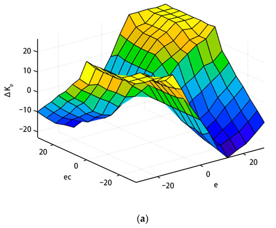 Through the Mamdani algorithm and the establishment of fuzzy rules, fuzzy inference is implemented to achieve fuzzy control. This enables precise regulation between the error e and the rate of change in error , ultimately fulfilling the objective of system adjustment. The formulated fuzzy rules are presented in Table 3, and the relationships between the fuzzy output variables , , and , are depicted in Figure 8.