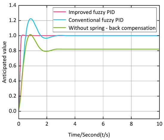To further verify the superiority of the springback compensation control strategy using the CWP optimization algorithm, under the same conditions, MATLAB/Simulink (Version R2021b) was employed to simulate the control effects of the circular roll forming process with and without the springback compensation control strategy, as well as with and without CWP optimization.