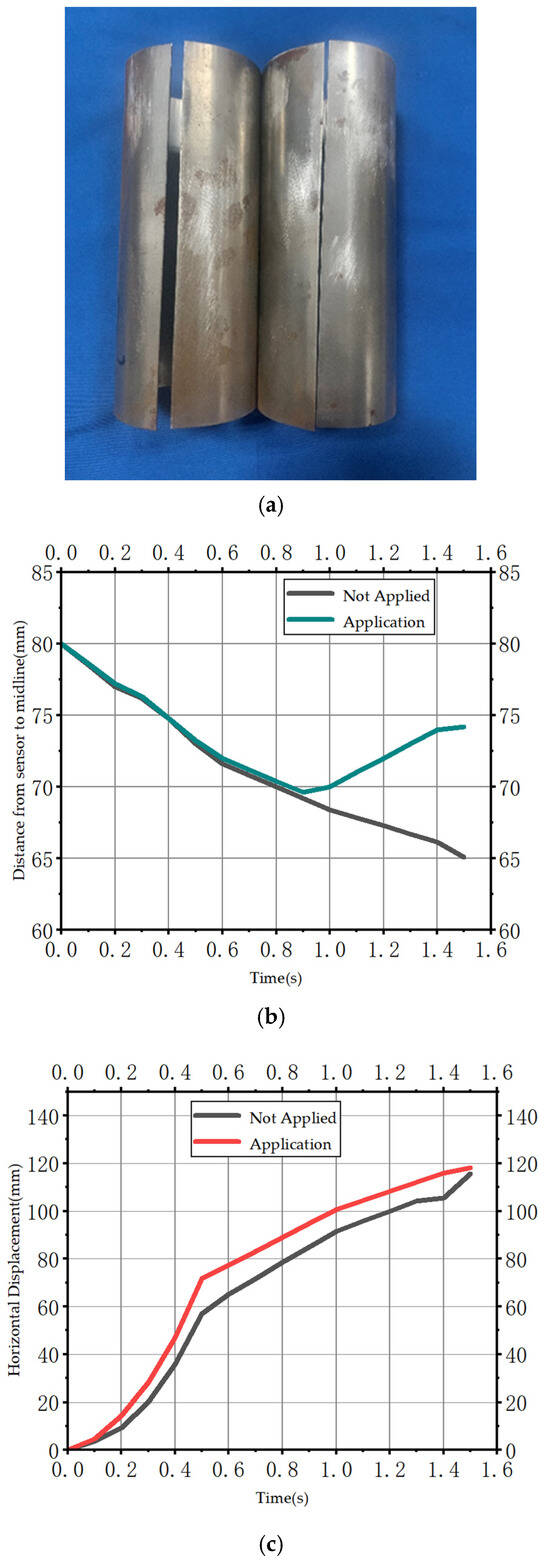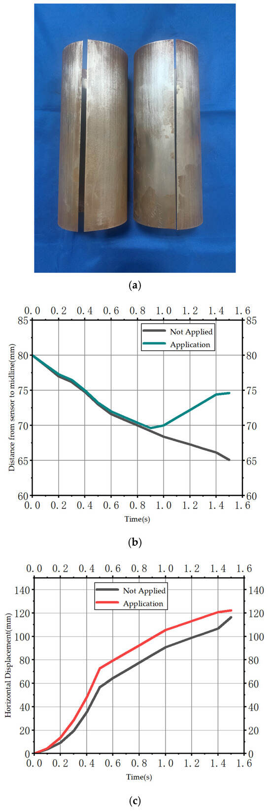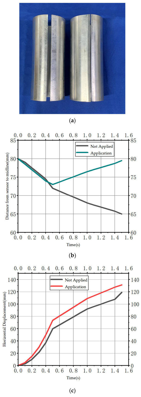 Figure 11a shows the effect of the circular roll forming of the aluminum alloy sheet metal. In the figure, for the cylinder on the left during the rolling process, the springback compensation strategy was not applied, while for the cylinder on the right during the rolling process, the springback compensation strategy was applied. In Figure 11b,c, “Not Applied” indicates that the springback compensation strategy was not applied, and “Application” indicates that the springback compensation strategy was applied.