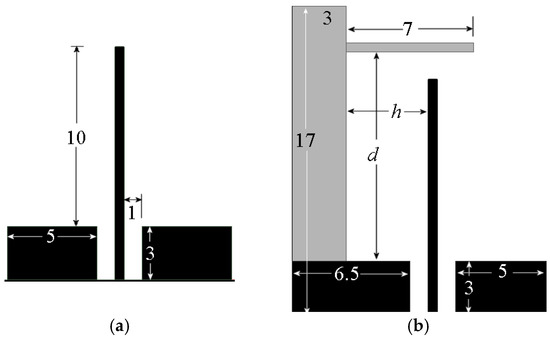(a) conventional strip monopole, scale in mm; (b) strip monopole with T-stub, scale in mm.