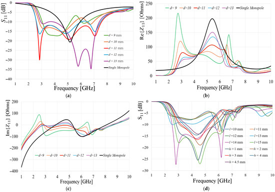 (a) S11 parameter, d in mm; (b) real part of the input impedance, d in mm; and (c) imaginary part of the input impedance; (d) variations of the S11 parameter for different stub length and positions.