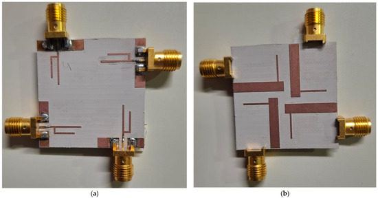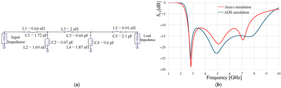 The values of the elements were determined based on the wideband coupling response obtained from the electromagnetic simulation, with initial values based on the reflection coefficient of a Butterworth filter prototype, and the final values were obtained through a parameterization process using Advanced Design System® (ADS 2025 Update 2.0). The comparison of the response obtained using electromagnetic simulation (Ansys) and the circuit model (ADS) is presented in Figure 3b.