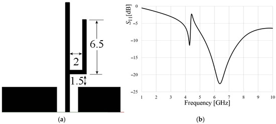 In order to expand, even more, the bandwidth of the antenna loaded with the T-shaped stub, an additional monopole with a shorter length is introduced. This shorter monopole creates a higher resonance, which overlaps with the resonance of the longer monopole, leading to a wider operating bandwidth. This approach is commonly used in antenna design and has been implemented in various structures, including logarithmic antennas [10] and fractal antennas [12]. The proposed configuration is displayed in Figure 4a, and its frequency response is presented in Figure 4b.