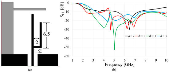 The proposed two-branches monopole antenna, loaded with the stub configuration is illustrated in Figure 5a, and its frequency response for varying values of d is depicted in Figure 5b.