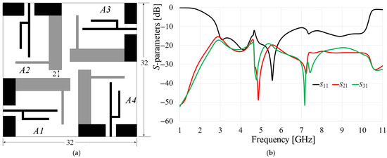 Based on the previous results, a four-element MIMO array is proposed which is illustrated in Figure 6a. An axial symmetry configuration was selected for the MIMO antenna design to maximize isolation among the radiated electric fields of the individual elements. Consequently, for a clearer representation of results, it is sufficient to illustrate the magnitude in dB of the S11, S21, and S31 parameters, as any other parameter combination would exhibit analogous behavior. The simulated S-parameter results are depicted in Figure 6b.