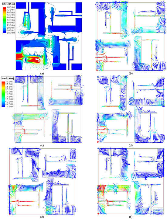 (a) E-field distribution at 5 GHz; surface current distribution at (b) 3 GHz, (c) 5 GHz, (d) 6 GHz, (e) 8 GHz, and (f) 10 GHz.