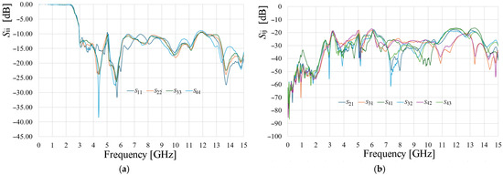 The analysis, presented in Figure 10c, compares the simulated and measured curves obtained from (8) for different values of θ1. In this case, for N = 4, the is influenced by three random phase angles, θ1, θ2, and θ3, which vary continuously within the range of 0° to 360°. To simplify the analysis, both θ2 and θ3 were fixed at 0°, while θ1 was varied. Both simulation and measurement results demonstrate that the remains below −10 dB from 2.7 GHz to 10.5 GHz and up to 11.7 GHz, respectively, confirming the wideband characteristics of the system. While both measured and simulated TARC curves align at the lowest cutoff frequency, indicating accurate initial design parameters, discrepancies within the specified bandwidth are likely attributed to fabrication tolerances. Minor variations in substrate thickness, dielectric constant, and conductor dimensions, inherent in the manufacturing process, can significantly impact high-frequency performance. These variations, which are not always perfectly modeled in simulations, lead to deviations in the measured results.