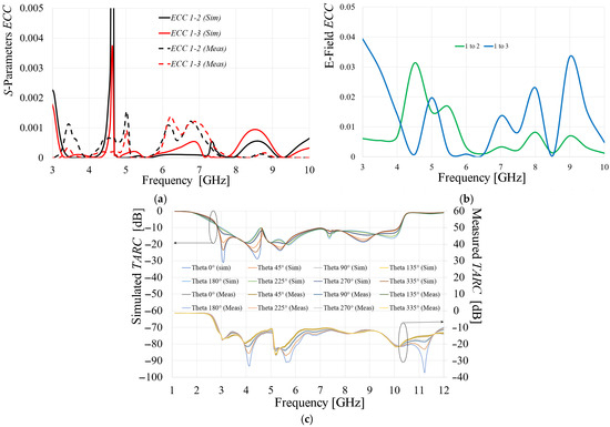 Comparison of measured and simulated results; (a) ECC S-parameters method, (b) ECC E-field method, (c) TARC.