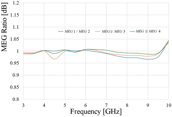 Finally, considering the MIMO metrics, the MEG ratio is calculated following (10) to (12), and the results are presented in Figure 11. According to [13], values of the MEG ratio around 1 dB are acceptable for MIMO applications, which threshold is valid for ±3 dB.