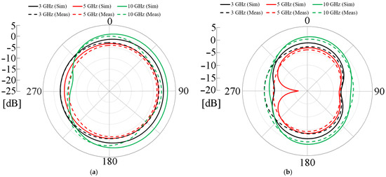 Regarding the radiation characteristics, Figure 12a,b provide a comparison of the simulated and measured gain patterns in the E- and H-planes at frequencies of 3 GHz, 5 GHz, and 10 GHz.
