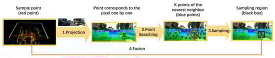 To enhance the integration of point cloud and image data, the study introduces the point-region fusion (PRF) module, a critical component within our network. This module encompasses four primary functions: projection, point searching, sampling, and fusion, as shown in Figure 2. The functionalities are delineated as follows: