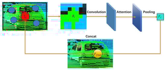 Among them, the feature is derived following the convolution operation and the pooling operation , subsequently undergoing a weighting process by the attention mechanism . represents the intrinsic point cloud features of the point . The ultimate fusion feature is prepared for application in the ensuing tasks of object detection and segmentation. The structure of this step is shown in Figure 4.