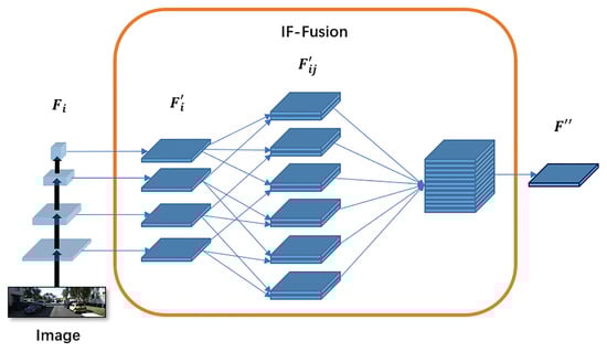 Initially, the process involves extracting features. For this purpose, a convolutional neural network is employed to analyze the input image I. This results in the generation of four distinct feature maps at varying scales, specifically maps , , and . The scale factor between each layer in the IF-Fusion module is set to 2, meaning that each subsequent feature map is downsampled by a factor of 2 compared to the previous layer. Here, is used to represent the feature map corresponding to the ith layer.