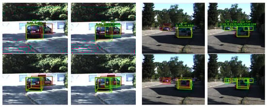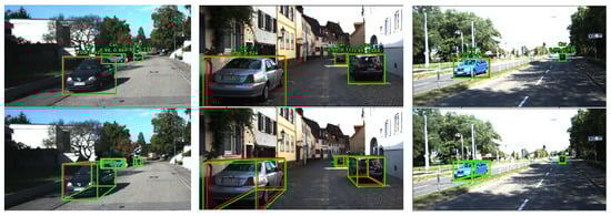 The network proposed undergoes training and testing on a personal computer with NVIDIA GTX 1080 Ti dual GPUs. This network includes a point cloud image feature fusion network based on PRF and an IF-Fusion image multi-scale feature fusion network. Figure 6 shows the final output effect. This study divides the 7481 training frames from the KITTI dataset [] into a training set and a validation set at approximately a 1:1 ratio. For assessment, this study follows the simple, moderate, and hard difficulty classifications proposed by KITTI. The network is optimized using the Adaptive Moment Estimation (Adam) algorithm. The initial learning rate is set to 0.002, with a weight decay of 0.001 and a momentum factor of 0.9. The model is trained end-to-end for approximately 50 epochs, with a batch size of 4. The balancing weights λ in the loss function are configured to 5.