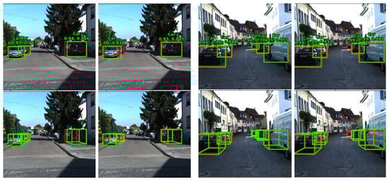 For the final 3D detection results, this paper uses two metrics to measure the precision of 3D localization and 3D bounding box detection. For 3D localization, this paper projects the three-dimensional boxes onto the ground plane to obtain a bird’s eye view of bounding boxes. This paper calculates the Average Precision of Bird’s Eye View (APBEV) bounding boxes. For 3D bounding box detection, this paper uses the Average Precision (AP3D) metric to evaluate the complete 3D bounding boxes. In the context of 3D object detection, AP3D evaluates the precision of fully 3D bounding boxes by considering their location, size, and orientation in three-dimensional space, providing a comprehensive measure of detection accuracy. Complementing this, APBEV assesses detection performance by projecting 3D boxes onto the ground plane, focusing on the accuracy of object localization from a bird’s-eye perspective, which is critical for tasks like autonomous driving.