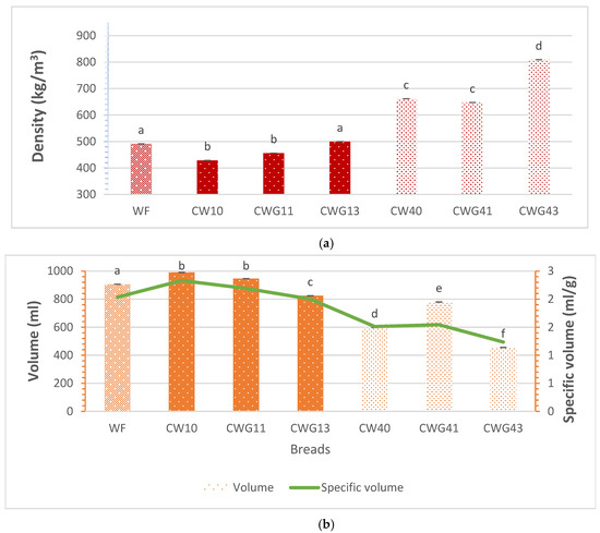 Physical properties of breads (a) Density, (b) Volume, and specific volume. Different small case letters correspond to significant differences (p < 0.05).