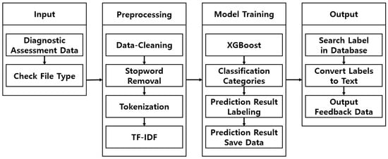 With the increasing emphasis on personalized learning, there is a growing demand for automated systems that analyze individual students’ learning states and provide effective feedback. This study proposes a system that analyzes elementary school mathematics diagnostic assessment data to generate personalized feedback. The proposed system integrates Term Frequency-Inverse Document Frequency (TF-IDF) and eXtreme Gradient Boosting (XGBoost) to vectorize textual data and automatically classify learning error patterns. The study utilizes 15,000 diagnostic assessment records collected from 2020 to 2024. After preprocessing, TF-IDF was employed to extract relevant features, and XGBoost was used to train a classification model. To validate the model’s performance, comparative experiments were conducted with Logistic Regression, Support Vector Machine (SVM), LightGBM, BERT, and DistilBERT. The TF-IDF + XGBoost model achieved an accuracy of 98.85% and an F1 Score of 0.9860, outperforming other models. Furthermore, the system demonstrated an average real-time processing speed of 1.3 s, ensuring instant feedback in educational settings. This study highlights the automation and scalability of educational data analysis, suggesting potential applications across various subjects and grade levels.