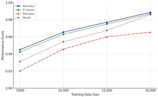 This study analyzes the impact of training data size on the performance of the proposed system. The size of the training dataset directly influences the model’s generalization capability and classification accuracy. Insufficient data may lead to underfitting, where the model fails to capture essential patterns, whereas an adequately large dataset enhances model stability and increases the likelihood of maintaining high accuracy. This section evaluates the relationship between dataset size and performance, examining the system’s data efficiency and scalability. For performance evaluation, the training dataset size was adjusted to 5000, 10,000, 15,000, and 30,000 instances, while the same test dataset (20% of the total dataset) was used for all experiments. The evaluation was conducted based on key performance metrics, including Accuracy, F1 Score, Precision, and Recall, under identical training and testing conditions described in Section 3.1 (System Architecture). The purpose of this experiment is to measure performance improvements as the dataset size increases and identify the saturation point, assessing the scalability and data efficiency of the proposed system.