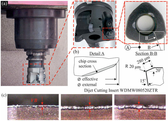 The machining investigations of the present study were conducted via a tool holder of 63 mm external diameter and cemented carbide inserts of HW-K05/K20 ISO specifications using the DIJET cutting insert WDMW080520ZTR, as displayed in Figure 1a. The geometrical characteristics of the tool holder and the cemented carbide inserts are illustrated in Figure 1b. The chamfer length on the inserts’ rake face measures approximately 280 μm, while the cutting-edge radius is 20 μm. Generally, chamfering on a carbide insert composes a critical design feature that enhances tool performance, durability, and machining quality in milling procedures [18]. In particular, chamfer geometries reinforce the cutting edge, making it less prone to chipping or breaking, especially during interrupted cuts or when machining hard materials. Furthermore, by strengthening the edge, the chamfer reduces wear and extends the lifespan of the insert, aiding in maintaining consistent performance over time, even under high-stress conditions. The flank wear VB was measured via an optical microscope, and typical results are exhibited in Figure 1c at various stages of the tool wear evolution.