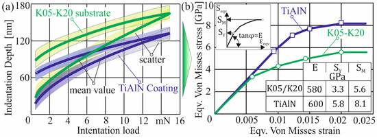 (a) Nanoindentation analysis; (b) The corresponding material constitutive stress-strain laws of the examined coated insert and its substrate.