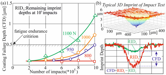 (a) Fatigue endurance determination based on coating failure depth; (b) a typical 3D imprint of the impact test and characteristic remaining imprint depths.