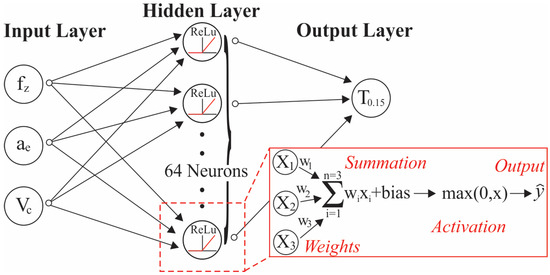 A regression-based AI model was developed using an ANN with PyTorch v2.6, where the model was designed to take three input features, pass them through a hidden layer with 64 neurons, and output a single continuous value as illustrated in Figure 5. The dataset was preprocessed using StandardScaler, which standardized the input features to have zero mean and unit variance before feeding them into the network. The ANN architecture consisted of an input layer with three neurons (representing fz, Vc, and ae), a hidden layer with 64 neurons that applied the ReLU (rectified linear unit) activation function, and a final output layer with a single neuron to produce the regression prediction that corresponds to the accumulative tool life of T0.15. The mean squared error loss (MSELoss) function was utilized to measure the difference between the predicted and actual values, ensuring the model minimized squared errors during training. The Adam optimizer was employed to update the model’s weights efficiently, balancing learning speed and convergence stability. Training was performed over 500 epochs, where the model iteratively adjusted its parameters using backpropagation. During each epoch, the optimizer refined the network weights based on the computed loss, gradually improving the accuracy of predictions. The final trained model was capable of capturing complex relationships within data, making it well-suited for regression tasks, as revealed in the next paragraph.