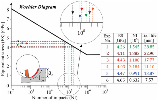 The outcomes of the milling FE simulation model coupled with the experimentally defined S-N diagram were considered in order to estimate the lifespan of the employed cutting tools on the test set. In particular, Figure 10 displays the forecasted number of cuts for each experiment of the test set, such as to achieve a flank wear equal to the predefined criterion. More specifically, the horizontal axis represents the number of cycles to failure (N) on a logarithmic scale, and the vertical axis shows the stress amplitude applied to the material during cyclic loading. Hence, the diagram indicates how many machining cycles the coated tool can endure before failure occurs. The main idea is that higher stress fields during the machining process (calculated via the FEM model in Figure 9c) would lead to a smaller number of cuts due to the determined Woehler diagram of Figure 8b [19].