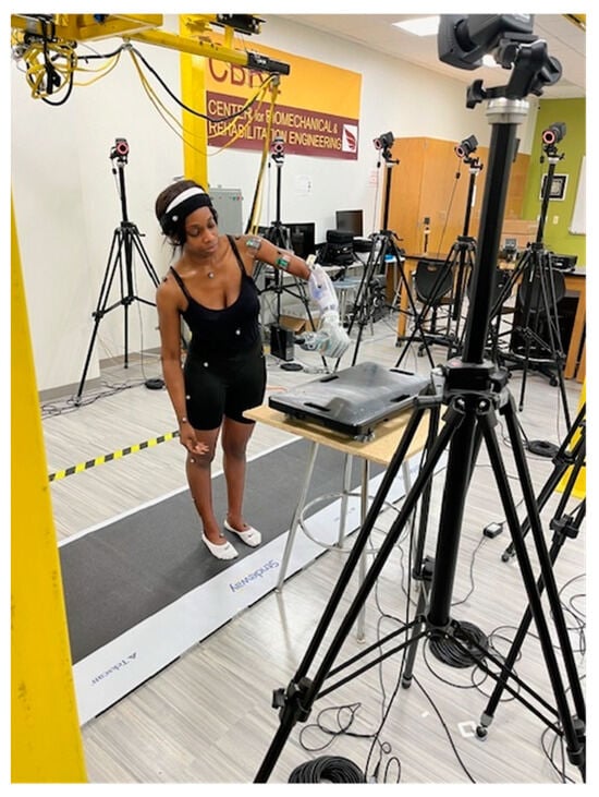 The performance evaluation consists of two visits to the Center of Biomechanics and Rehabilitation Engineering (CBRE) at UDC and the training program at home for two weeks. The first and second visits were used to evaluate the baseline and post-training performances of the user with i-Limb Access, respectively. Each visit took roughly two hours. The evaluation protocol implemented an experimental setup, as shown in Figure 1, utilizing the Vicon motion capture system (Vicon Motion Systems, Oxford, UK), Tekscan Strideway pressure mat (Tekscan, Inc., Norwood, MA, USA), and wireless EMG modules (Delsys, Natick, MA, USA) to identify the outcome measures. The sampling rates for these systems are 100 Hz, 40 Hz, and 1000 Hz, respectively. The participant stood in front of a testing platform made of a lab stool whose height was adjusted by placing the non-metal boards on the top to ensure that the participant could comfortably perform the experimental tasks.