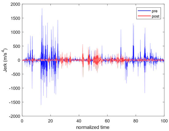 The time it takes to complete each trial of the task was normalized to 1001 timeframes between 0 and 100 in the comparison of the outcome measures such as temporal angle of trunk and shoulder, movement smoothness (Jerk), vertical ground reaction forces, and selected muscle activations. A normalized time of 0 means the start of the task, whereas 100 means the completion of the task. vGRFs were also normalized with respect to the participant’s body mass. Figure 3, Figure 4, Figure 5, Figure 6 and Figure 7 show the exemplary plots for shoulder and trunk angles, object control, movement smoothness, normalized vGRFs, and muscle activation against normalized time between baseline and post-evaluation for the box lift task, respectively.