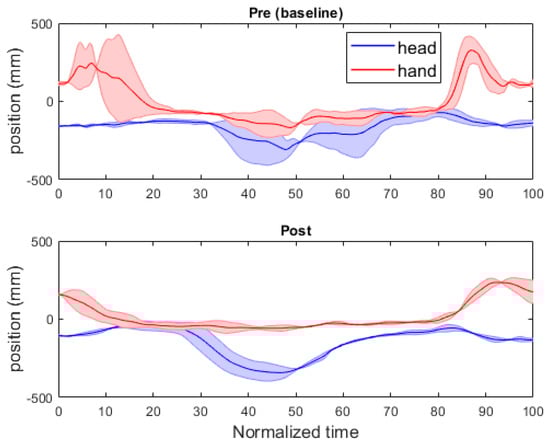 Hand and head movement trajectory comparison of box lift task. The color-shaded regions represent the mean and standard deviation of the head and hand trajectories across all trials of the box lift task at that time point.