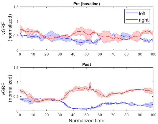 On the one hand, the statistical comparison was cautiously applied to some outcome measures. Wilcoxon ranksum test [], an equivalent to the t-test from a non-parametric category, was applied to the calculated value of joint angles, movement smoothness of hand module, vGRFs from the left side and right side, and four muscle activations at each normalized time point. On the other hand, we performed a direct comparison of task completion time, correlation coefficient values, and closeness to the Right, as the sample size was too small for each measure. As data are collected from more participants, the ranksum test will be utilized to compare all outcome measures to determine if there is a significant change in each measure.