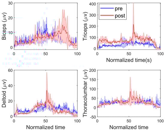 In terms of muscle activations, we did not collect the maximum voluntary contractions (MVC) for the selected muscles due to time constraints. Therefore, the reported muscle activation values were not normalized with respect to their MAVs, respectively. For the participants in the future, we will use Delsys EMG sensors to record the MVCs of the biceps, triceps, deltoid, and thoracolumbar muscles during both baseline and post-evaluation using the following procedure. The biceps MVC will be obtained by having the participant sit or stand with the forearm supported and the elbow flexed at a 90° angle and then instructing the participant to pull against a fixed resistance (e.g., a researcher’s hand) as hard as possible, focusing on elbow flexion. The triceps MVC will be obtained by positioning the participant with the forearm supported and the elbow extended at a 90° angle and then instructing them to push against a fixed resistance (e.g., a researcher’s hand), focusing on extending the elbow. To obtain the deltoid MVC, the participant will be positioned with the left arm abducted at a 90° angle from the side, and they will then be instructed to push against a fixed resistance (e.g., a researcher’s hand), focusing on the shoulder abduction. To obtain the thoracolumbar muscle MVC, the participant will be instructed first to lay prone on a mat with arms extended overhead and then to lift legs and chest off the ground, focusing on contracting the middle and lower back muscles.