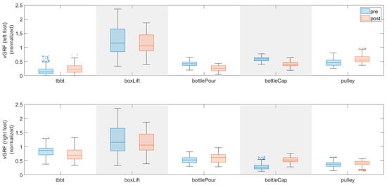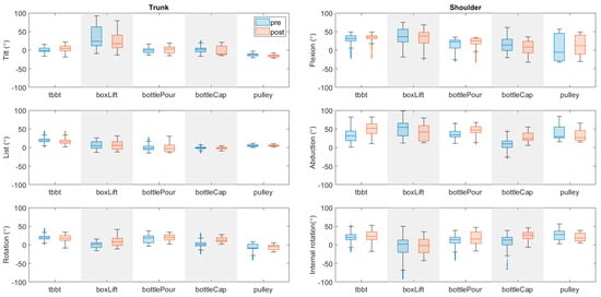 All five tasks between baseline and post-evaluation were compared. MATLAB Boxchart was used to display the data of the following outcome measures with the median, the lower and upper quartiles, any outliners, and the minimum and maximum values that are not outliers: trunk and shoulder angles (Figure 8), movement smoothness (Figure 9), vGRFs (Figure 10) and muscle activations (Figure 11).