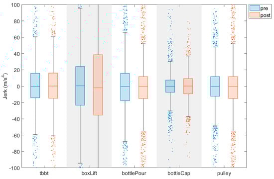 On average, the time for the tBBT, box lifting, bottle pouring, and pulley task tasks decreased by 24.0, 1.6, 9.0, and 8.4 s, respectively, while the time for the bottle cap task did not change. The increased average shoulder angle in all three axes in most tasks during post-evaluation may indicate that the left shoulder joint became more engaged in performing these tasks. However, the increased average trunk angle in all three axes in some of these tasks may also indicate that the trunk compensation was not reduced to some extent. In addition, the post-evaluation angle changes also appear smoother than the angle changes in the baseline evaluation, which may indicate that the participant had greater control of movement. When comparing these angle data, one caveat is that these joint angle differences for both the trunk and shoulder may not be clinically meaningful enough to conclude whether the training procedure was effective or ineffective. There does appear to be larger spikes in the baseline evaluation, meaning there may have been larger jerk movements, although no significant change was shown in the averaged jerk value.
