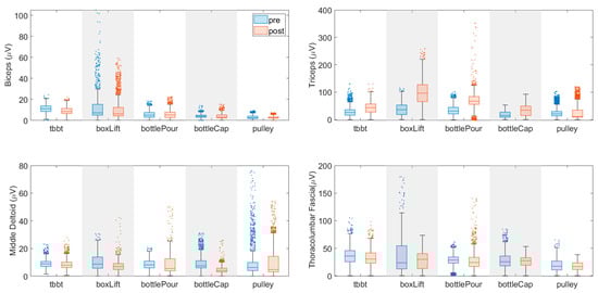 Comparison of four muscle activations for each task. The outliners are jittered, and the marker style has been changed for better display.