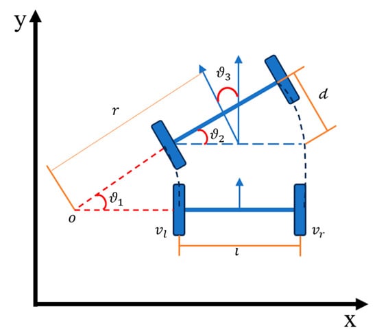 Navigation technology and machine learning have rapidly developed in recent years. The most common kinematics model for mobile robots is differential control, as depicted in Figure 1. The equations for differential control, centered on the two-wheel axis, are shown in (1)–(3). The distance from the center of the arc motion trajectory to the wheel centers is described by Equations (4)–(6), accomplished through odometry and Map–Server synchronization. The motion equations translate odometry data to the robot’s coordinates, as shown in Equation (5).