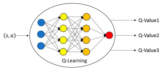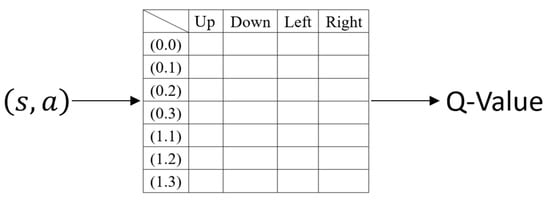 Q-Learning, as shown in Figure 2, guides machine learning to select the best path based on the current state (such as the target position of the field). This selection is based on a reward called “Q-value”, which represents a certain value under a specific state; the goal of the algorithm is to maximize the overall reward (Q value) and learn the best action strategy [9]. Q Learning is a value-based reinforcement learning method. Its core is to learn a value function Q(s, a) that represents the expected future reward for acting in state s, as in (8), which shows the formula Q(s, a) for obtaining the updated value of Q for Q-Learning; the individual meanings are shown in Table 1 [10,11,12,13,14].