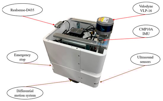 As shown in Figure 6, the AMR has a length, width, and height of 40 cm. The RGB-D Realsense D435 camera is used for tag recognition, enabling precise self-localization. A CMP10A-IMU, positioned on the left side of the Velodyne VLP-16, helps eliminate movement errors and improves motion accuracy. The chassis features a differential wheel motion system and a 150-watt servo drive, ensuring smooth and continuous operation. A removable 24 V/36 Ah battery allows the robot to operate for up to 8 h, enhancing its practicality and endurance. To achieve high-precision mobility, the Velodyne VLP-16 LiDAR provides 16 laser beams, a detection range of up to 100 m, and a scanning rate of 300,000 points per second, ensuring detailed mapping and obstacle detection. For enhanced safety, three ultrasonic sensors are installed at the bottom of the robot. When an obstacle is detected, the robot will automatically stop and resume route planning once the obstacle is cleared. Additionally, an emergency stop button is installed, allowing immediate power cutoff to the motor in case of an emergency, ensuring that the AMR stops movement instantly to prevent potential hazards.