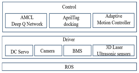 The software design architecture of the AMR is based on ROS (Robot Operating System) communication and consists of three main layers: the drive layer, the control layer, and the application layer. As shown in Figure 7, the drive layer is responsible for handling the robot’s hardware actuation and sensory input, including the DC servo, which controls the movement of the wheels, the camera for perception and object recognition such as AprilTag identification, the BMS (Battery Management System) for power distribution and battery monitoring, and the 3D laser and ultrasonic sensors, where the Velodyne VLP-16 LiDAR provides high-resolution 3D mapping and obstacle detection, while ultrasonic sensors enhance close-range safety by stopping the robot when obstacles are detected. The control layer is responsible for decision-making, navigation, and adaptive control, integrating multiple algorithms to enhance autonomy. It includes AMCL (Adaptive Monte Carlo Localization) and Deep Q Network (DQN), where AMCL enables probabilistic localization within a map, and DQN optimizes navigation and path planning through reinforcement learning. The AprilTag docking module utilizes the Realsense D435 RGB-D Camera for AprilTag recognition, enabling precise docking and positioning. Additionally, the adaptive motion controller adjusts the robot’s movement based on environmental feedback, improving stability and responsiveness. The ROS application layer serves as the communication backbone, facilitating real-time data exchange between the drive and control layers, ensuring seamless operation of the robotic system. The overall architecture ensures that the AMR can efficiently navigate, avoid obstacles, and accurately dock using AprilTags, making it well-suited for autonomous operations in dynamic environments.