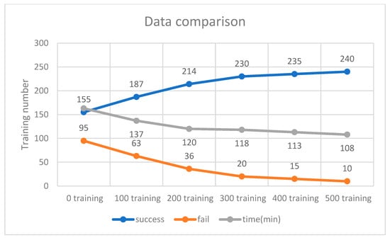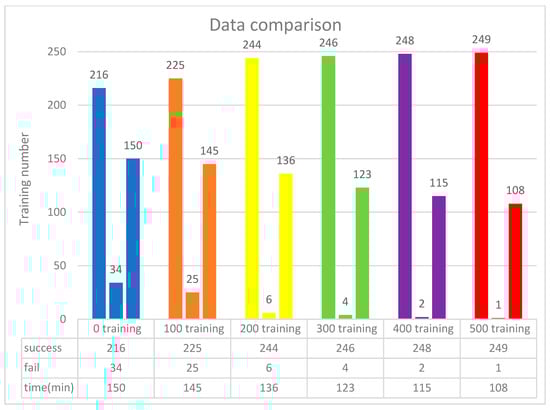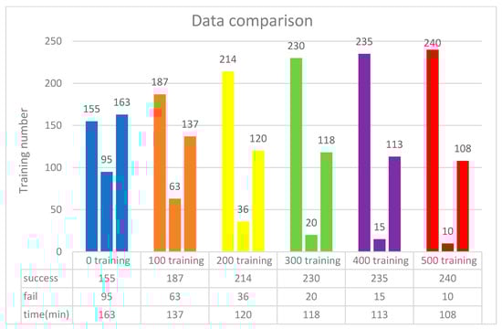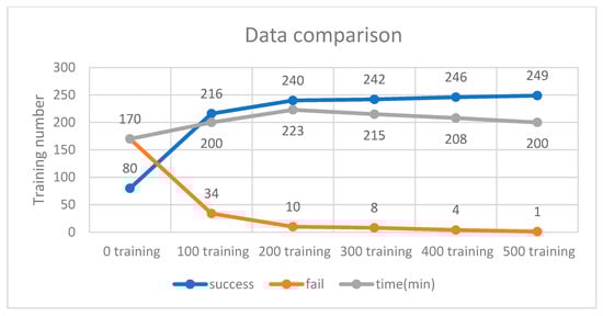 The training scenario using 64 neurons is shown in Figure 15. Initially, without prior training, the system underwent 250 iterations, during which the DQN failed to process input parameters 170 times due to the lack of prior experience. Subsequently, 500 successful training iterations were fed into the DQN, and the model was retrained accordingly. As a result, the initial 500 failures were significantly reduced to just one. These findings indicate that incorporating more successful training data minimizes failure rates and optimizes execution time. As shown in Figure 16, experimental verification demonstrated that 500 training iterations were sufficient to achieve a stable success rate, as shown in Figure 17.
