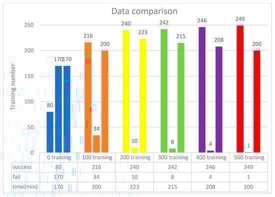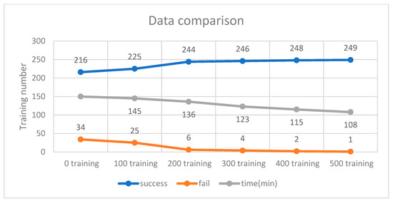 The training scenario using 50 neurons is shown in Figure 12. Initially, without prior training, the system underwent 250 iterations, during which the DQN failed to process input parameters 34 times due to the lack of prior experience. Afterward, 500 successful training iterations were fed into the DQN, and the model was retrained accordingly. As a result, the initial 500 failures were significantly reduced to just one. These findings indicate that incorporating more successful training data helps minimize failure rates and optimize execution time. As shown in Figure 13, experimental verification demonstrated that 500 training iterations were sufficient to achieve a stable success rate, as shown in Figure 14.