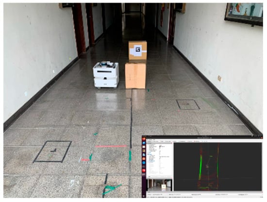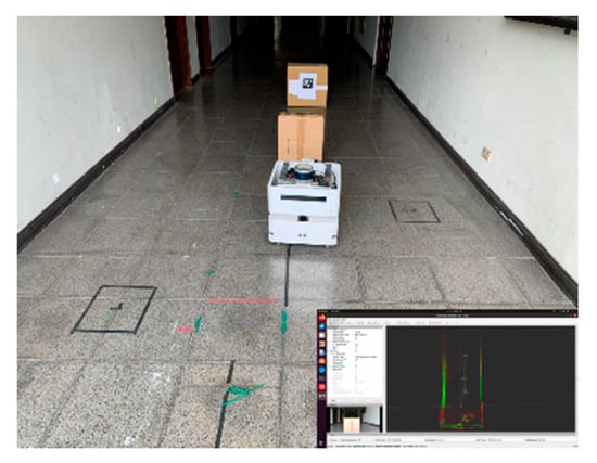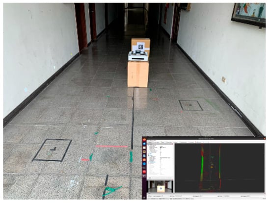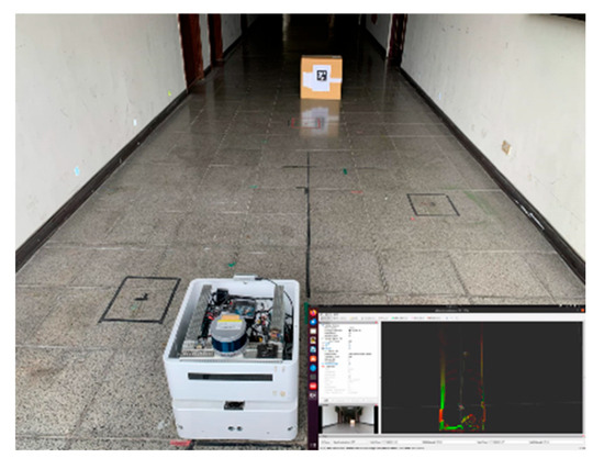 In this experiment, it was found that after 500 iterations of training, the learning effect was better, and the training data was input into the DQN model of the real robot. In actual situations, the robot first uses a camera to detect the direction of AprilTag and then moves to the middle position. If it encounters an obstacle during the movement, it will stop first and then avoid the obstacle. After completely avoiding the obstacle, it will return to the middle. The seat completes the docking action, and then the robot moves steadily and continuously towards AprilTag, as shown in Figure 19, Figure 20, Figure 21, Figure 22 and Figure 23.