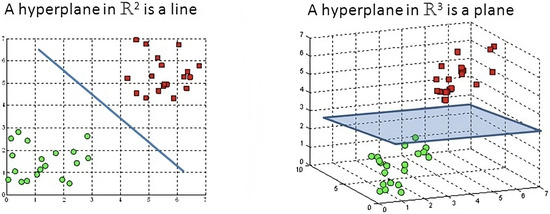 Examples of a hyperplane in 2D and 3D space. Source: Deep AI [18].